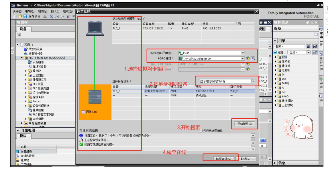 2.打开博图软件,新建项目、添加设备,找到对应设备系列、型号、版本等,添加。